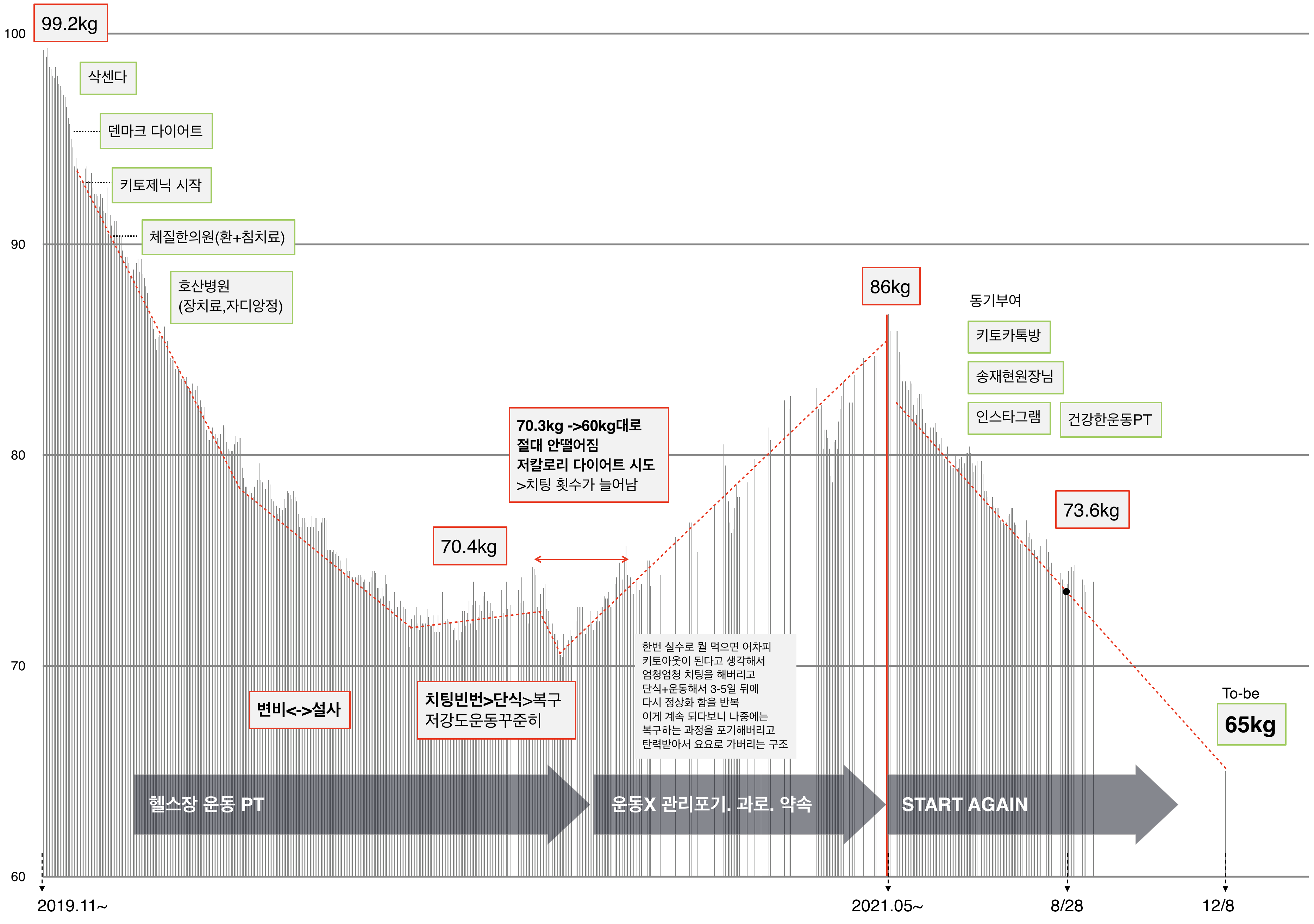 2019년 12월 ~ 3년반간의 키토라이프 리뷰 #1 감량 2020년 1년차 : 28kg 감량 반년간 급격히 25kg 감량 반년간 서서히 3kg 감량 #2 1차 요요 2021년 2년차 : 증량과 감량 반년간 16kg 증량 반년간 16kg 감량 #3 유지 2022년 3년차 : 유지 5kg을 넘나들긴했지만 운동을 뽀시며 유지 #4 두번째 요요 2023년 4년차 : 반년간 10kg 증량 와 정말, 다이어트 안한 몸 좀 사고싶다. 다이어트 안해본 그때로 리셋해서 이 괴로움들에서 좀 벗어나고 싶다. 어떻게 이렇게 항상 극단적일수가 있을까? 하루종일 감량 생각이랑 다이어트에 대한 공부만 했던 시기가 있었고, 그냥 먹고싶은거 다 먹어버리고 무한 증량의 루프로 들어가버리는 시간의 반복이 있었다. 항상 재앙의 시작은 "..